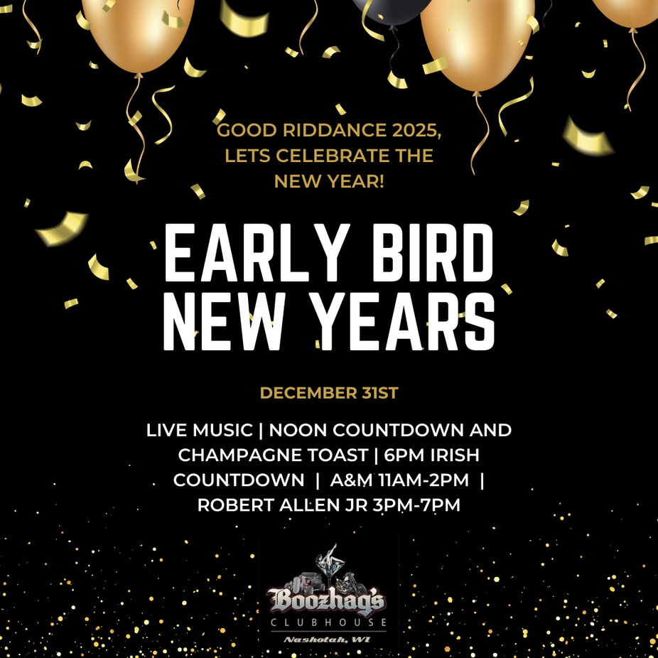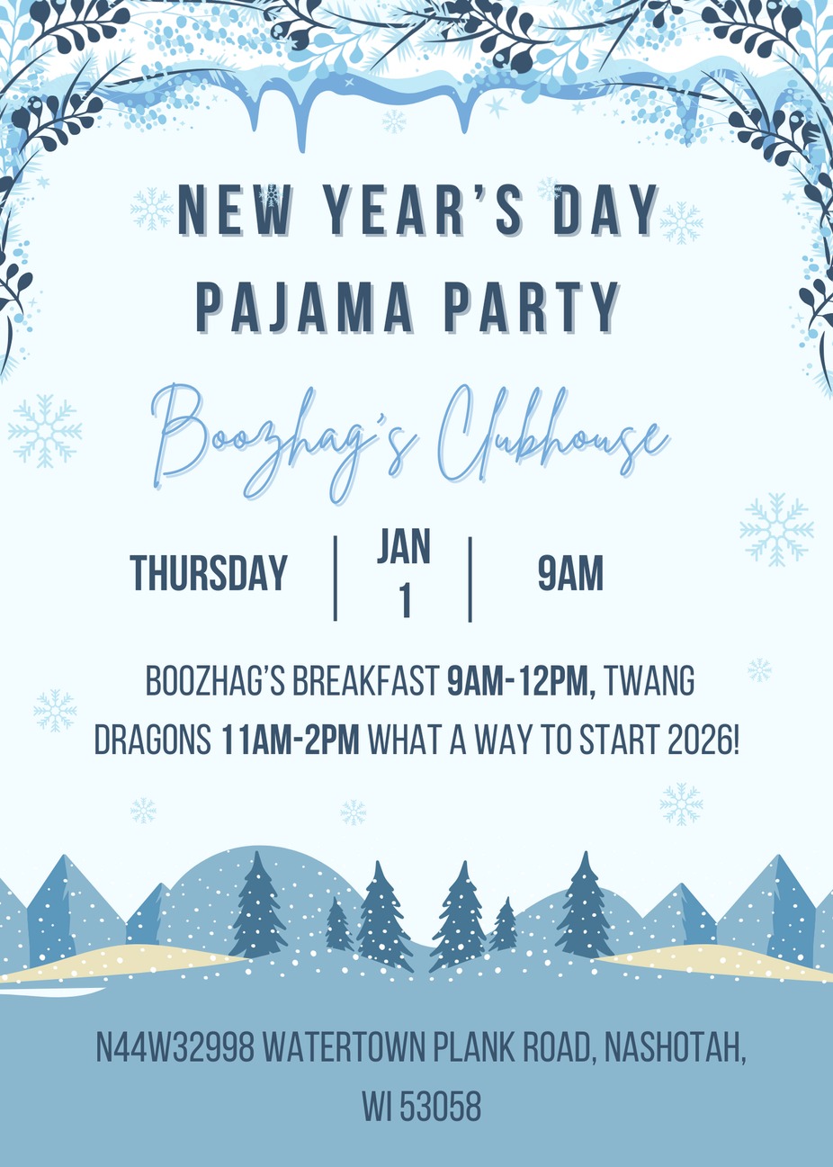 GOODBYE 2025! Join us at Boozhag's for a fun filled day! New Year's Day Pajama party starting at 9AM with breakfast and LIVE music from the Twang Dragons 11AM-2PM! Roll out of bed and start all over again! Happy New Year from all of us at Boozhag's Clubhouse! Cheers to a healthy, happy & blessed 2026! Food Specials: 9AM-12PM: Breakfast 12PM-9PM: $20 BYO 16" Pizza (unlimited toppings) Don't forget to stop by our sister bar Ole's Tap for more fun! Cheers to the NEW YEAR!